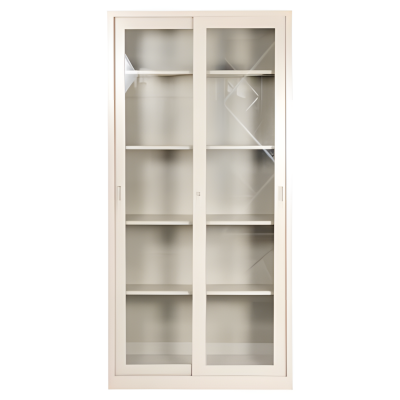 Armario metálico de puertas corredizas en vidrio con cuatro tablillas ajustables,
