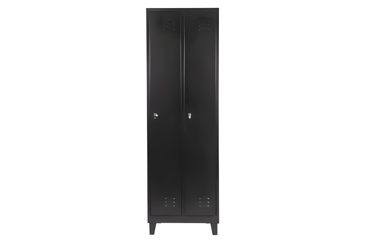 Locker metálico 2 columnas color negro, 2 puerta con aldabas para colocar candados, 1 tablilla interna y barra