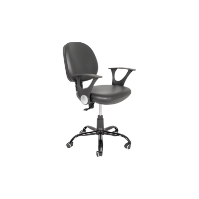 Silla Semi-Ejecutiva, asiento de espuma moldeada, con respaldo y asiento en cuerina negra, estructura con brazos fijos, base de metal negra